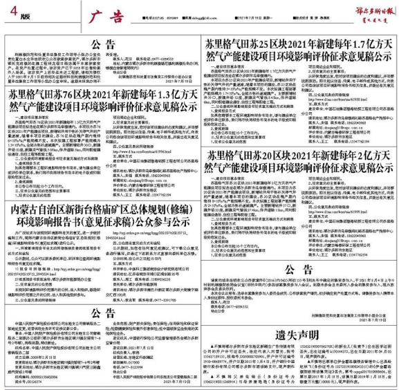 在第二次網絡公示期間,分別在2021年7月15日和2021年7月19日在鄂爾多斯日報報紙上進行了兩次登報公示,每次公示時間為5個工作日,報紙公示截圖詳見下圖。